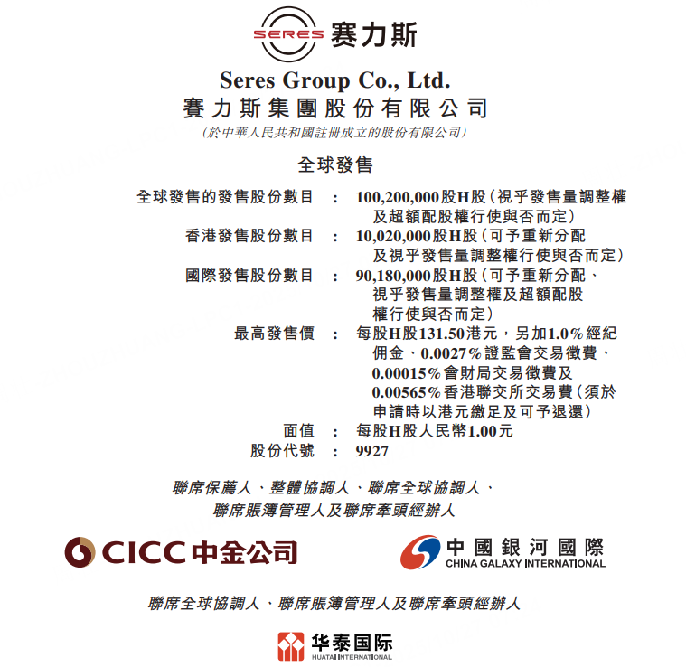 10月27日,賽力斯於10月27日-10月31日招股,擬全球發售1.002億股H股,香港公開發售佔10%,國際發售佔90%,另有15%超額配股權獲和15%發售量調整權。發售價將不高於131.50港元,每手100股,預期H股將於11月5日在聯交所開始買賣。