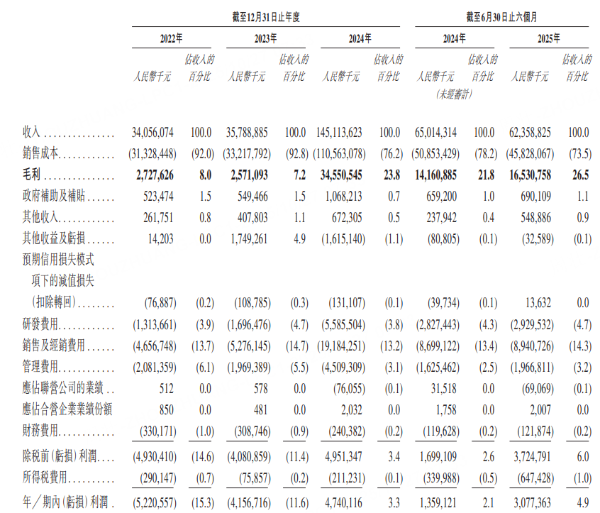 淨利潤:於2024年及截至2025年6月30日止六個月,實現盈利。根據弗若斯特沙利文報告,該公司是全球第四家實現盈利的新能源車企。2023年,該公司錄得歸母淨虧損人民幣24億元;而2024年及截至2025年6月30日止六個月,該公司錄得歸母淨利潤分別為人民幣59億元及人民幣29億元。