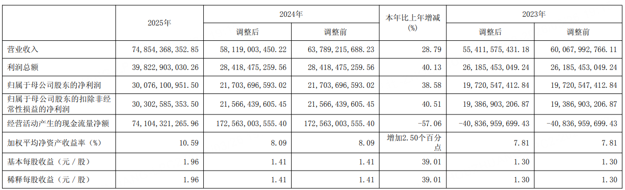 3月26日,中信證券公告,公司2025年實現營業收入748.54億元,按年增長28.79%;歸屬於母公司股東的淨利潤為300.76億元,按年增長38.58%。本報告期利潤分配預案:每10股派發現金紅利人民幣4.10元(含稅),此預案尚需本公司股東會批准。此外,公司已在2026年2月派發2025年中期現金紅利每10股人民幣2.90元(含稅)。本報告期合計擬派發現金紅利每10股人民幣7.00元(含稅)。