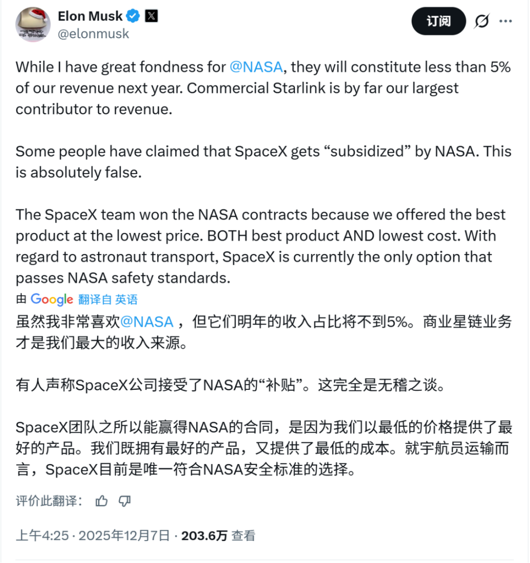 不過,馬斯克最近在推特中就反駁了靠和NASA關係獲得訂單從而支撐業務的說法,而且他提到2026年NASA給的訂單隻佔總收入的5%,最關鍵的還是商業星鏈業務。