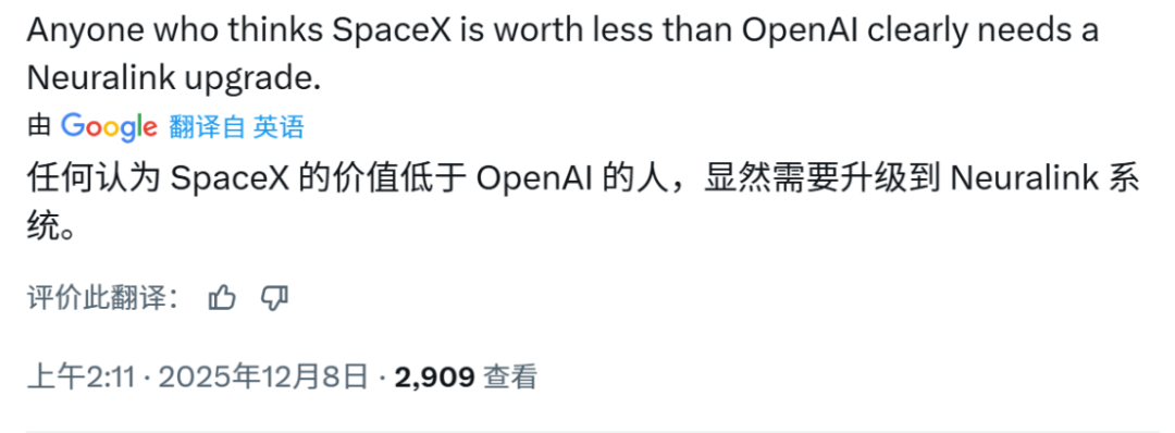 還有用戶說到,任何認為SpaceX價值低於OpenAI的人,顯然需要腦機接口升級一下認知。