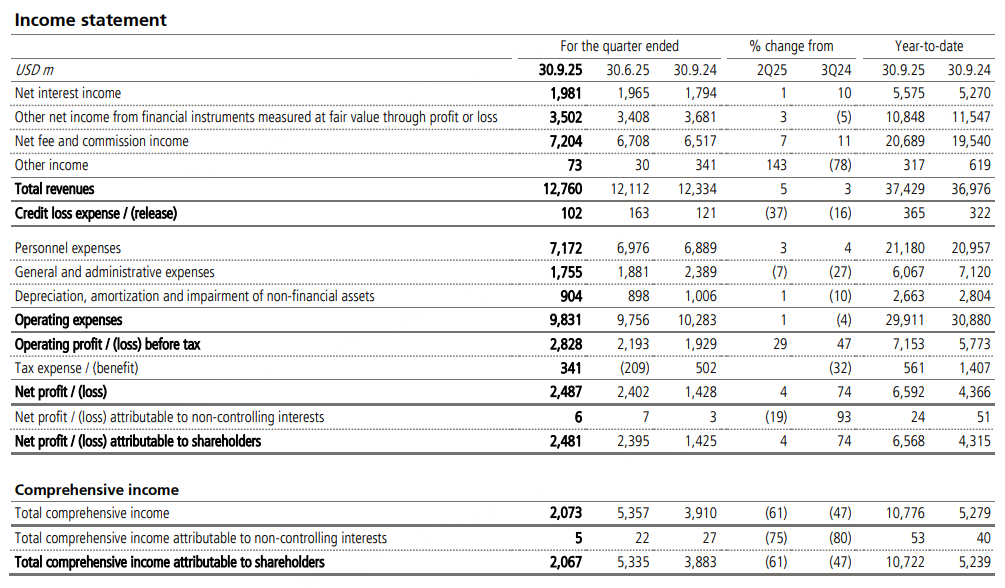 整合工作進展順利,超過三分之二的瑞士銀行客戶賬戶已完成遷移;資產管理業務的整合工作已基本完成。本季度通過退出機制進一步節省了9億美元的毛成本,累計成本削減額達到100億美元,比原計劃提前一個季度。這相當於到2026年底預計節省的約130億美元毛成本的77%。