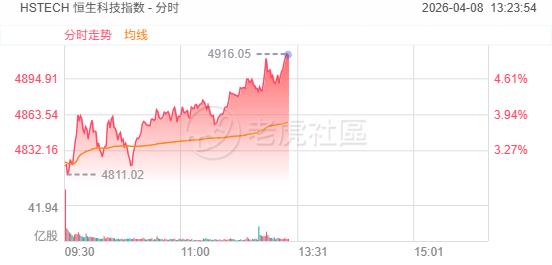 4月8日,恒生科技指數午後升逾5%,半導體板塊持續發力,華虹半導體升逾15%。
