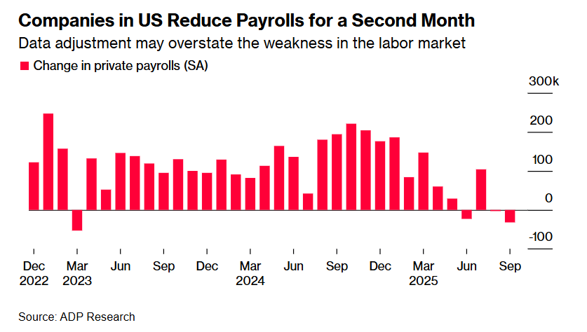 這種投資者們所依賴的「重要統計信息真空」迫使市場與聯儲局只能依賴替代性質的統計指標,其中週三公佈的「小非農」ADP月度私營部門就業報告格外引人關注。週三公佈的數據顯示,ADP就業人數意外減少3.2萬人,且前值被修正為減少3000人,而市場此前普遍預期為增加5.1萬人。