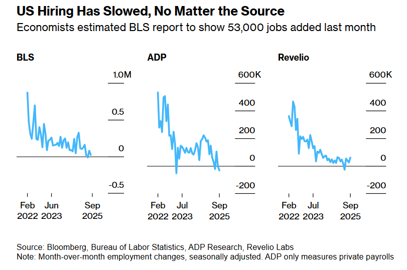 即便沒有來自美國勞工統計局(BLS)的重磅非農數據(由於美國政府停擺,本週五未能及時發佈,具體的數據發佈時間處於待定狀態),近日公佈的一系列私營部門統計指標也指向9月美國企業整體招聘活動進一步疲軟、裁員有限、薪資溫和增長以及企業對勞動力需求放緩。