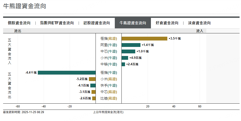 恒指熊證上日淨流入3500萬元,阿里牛證淨流入1400萬元,中芯牛證淨流入1000萬元;