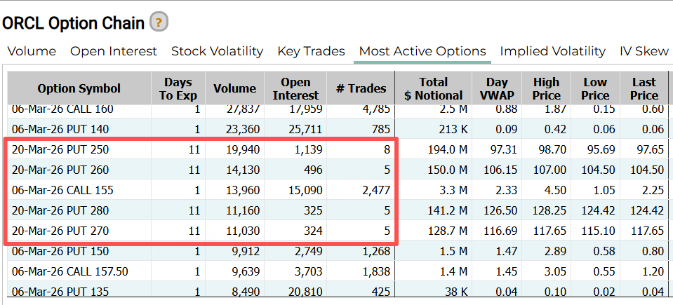 期權方面,甲骨文昨日的前十大成交中,幾張3月20日到期的認沽合約(PUT)排名居前,價格在250美元以上,最高達280美元。