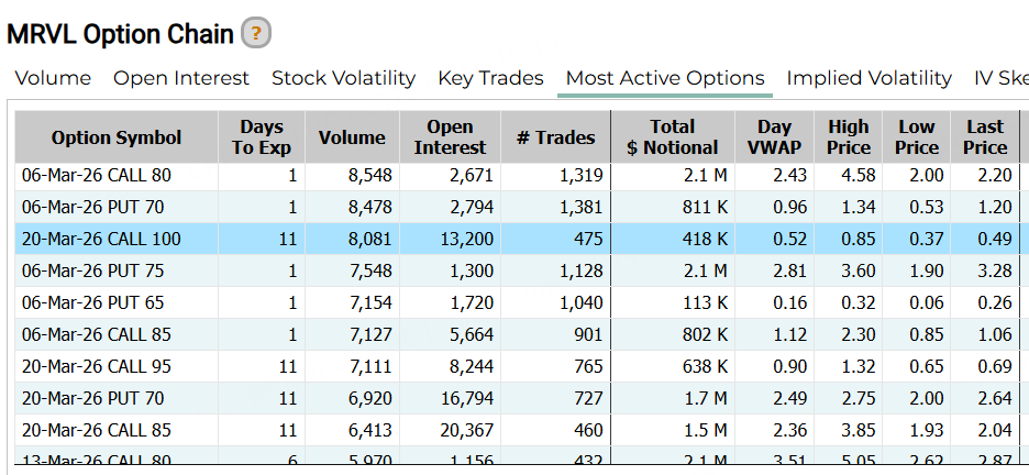 邁威爾科技昨日成交的前十大合約中,一張CALL的行權價達到100美元,較現價有30%以上的漲幅空間,到期日為3月20日。