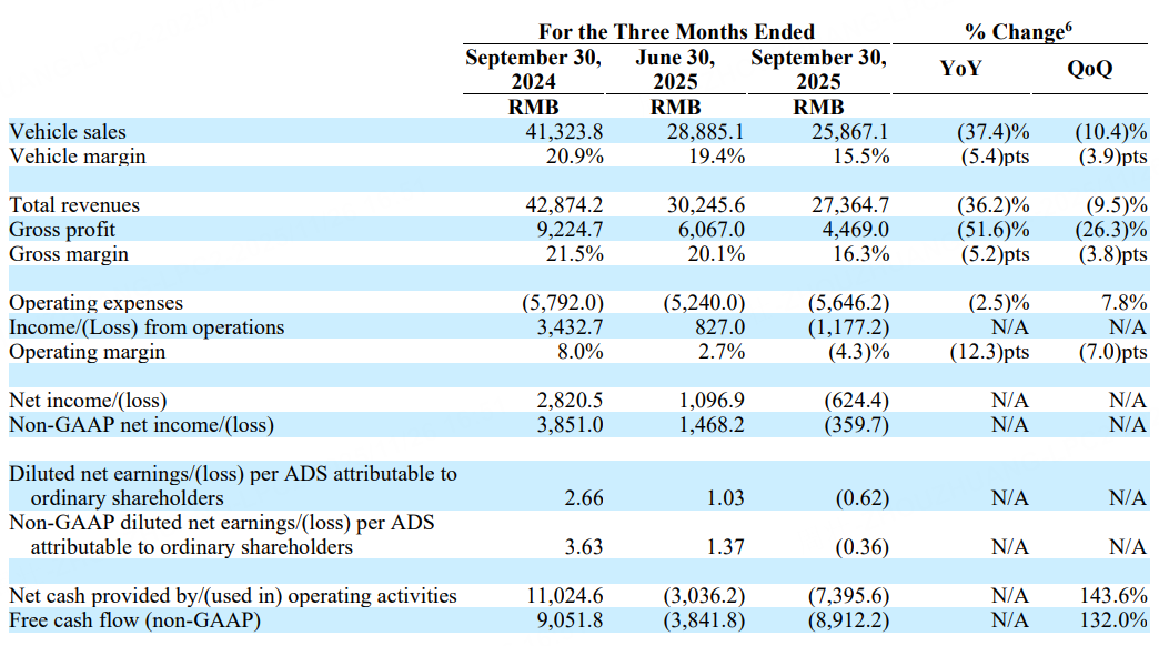 2025 年第三季度營業虧損為人民幣 12 億元(1.654 億美元),而 2024 年第三季度營業收入為人民幣 34 億元,2025 年第二季度營業收入為人民幣 8.27 億元。