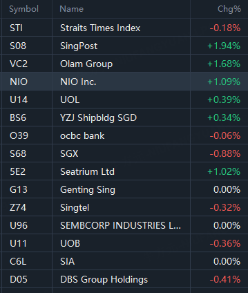 Singapore stocks opened lower on Thursday. STI down 0.2%, SingPost up 2%, Olam up 1.7%, Nio up 1%.
