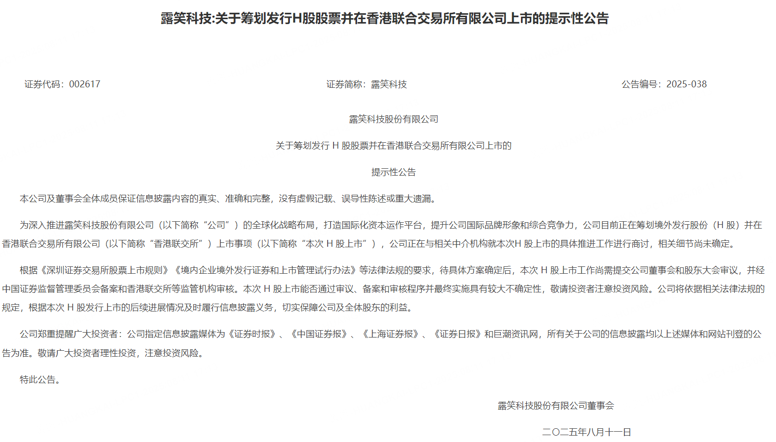 8月11日,露笑科技公告稱,公司正在籌劃境外發行股份(H股)並在香港聯合交易所有限公司上市,以推進全球化戰略佈局,打造國際化資本運作平臺,提升國際品牌形象和綜合競爭力。