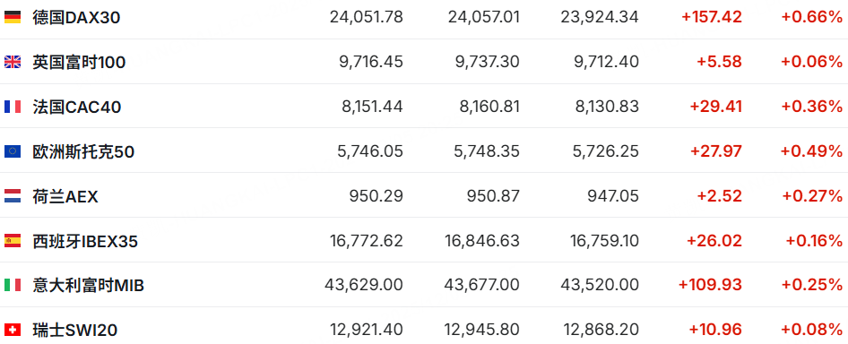 歐洲主要股指普漲,德國DAX30漲0.66%,法國CAC40漲0.36%。