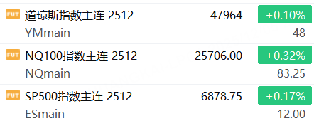 12月5日,美股三大股指期貨上漲,截止發稿,道指期貨漲0.14%,納指期貨漲0.03%,標普500指數期貨漲0.09%。