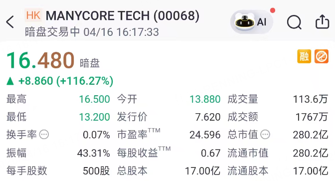 4月16日周四, MANYCORE TECH 開啓暗盤交易,盤初暴升逾116%。不計手續費,每手賺超4000港元。公司是「杭州六小龍」之一,被稱為全球空間智能第一股。