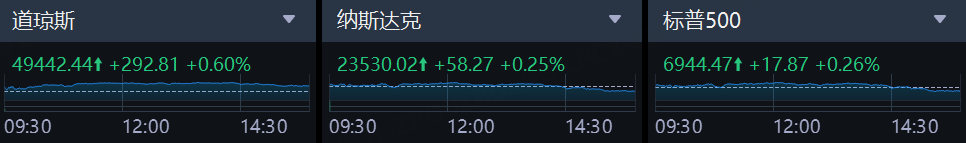 美東時間周四,美股三大指數集體收漲,截至收盤,道指漲292.81點,漲幅為0.60%,報49442.44點;納指漲58.27點,漲幅為0.25%,報23530.02點;標普500指數漲17.87點,漲幅為0.26%,報6944.47點。
