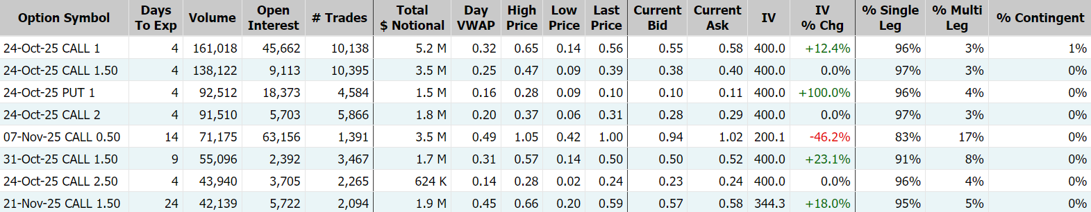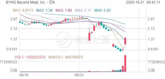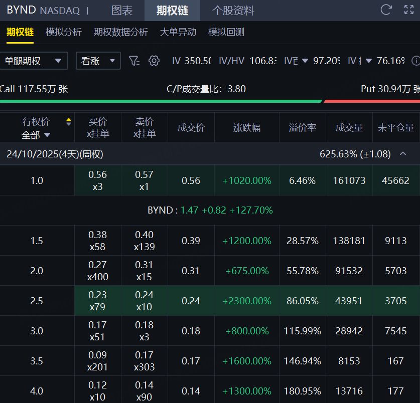 期權方面,Beyond Meat當日期權成交147.91萬張,較90日均量放大逾30倍,看漲期權佔比升至79.2%,其中於10月24日到期的1美元行使價的看漲期權成交居前,成交超16萬張;此外,從期權鏈上看,Beyond Meat多張Call單大漲逾1000%。 $BYND 20251024 1.0 CALL$
