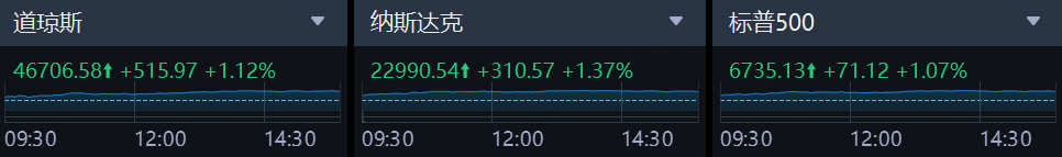 美東時間週一,隨着貿易形勢緩和,加上蘋果股價大漲的助攻,三大指數均漲超1%,重回歷史高位附近。截至收盤,道瓊斯指數漲1.12%,報46706.58點;標普500指數漲1.07%,報6735.13點;納斯達克指數漲1.37%,報22990.54點。