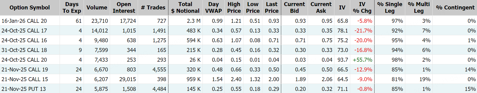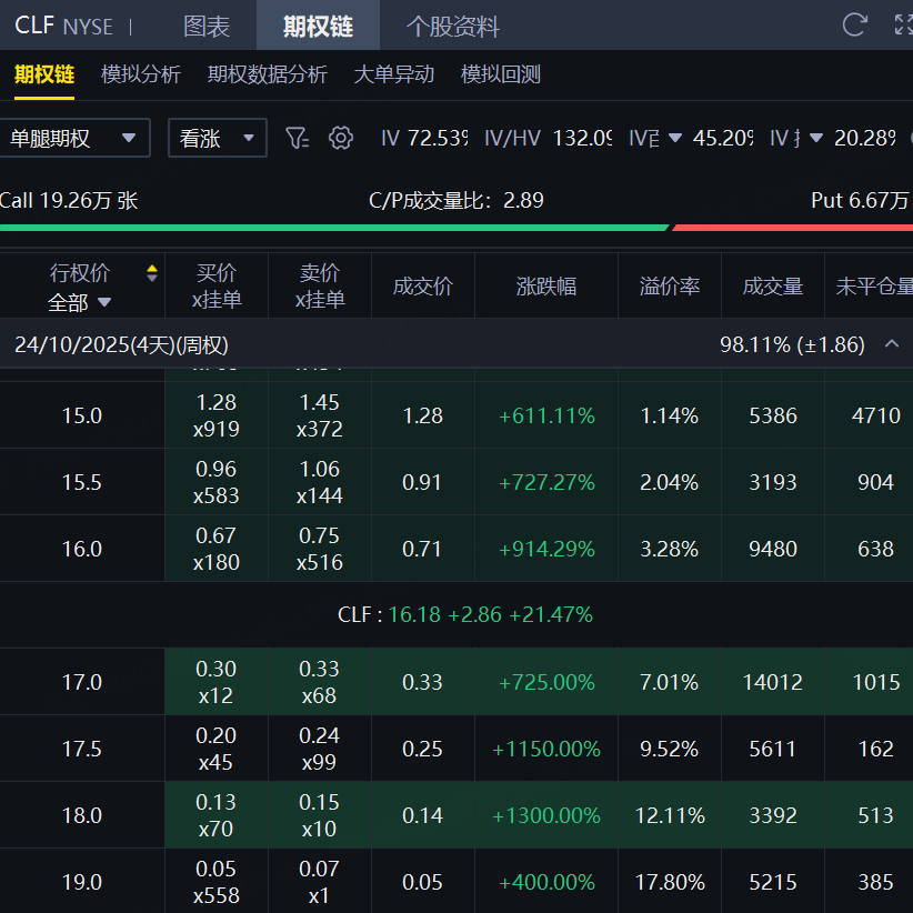 期權方面,克利夫蘭克裏夫當日期權成交25.91萬張,較90日均量放大近6倍,看漲期權佔比升至74.3%,其中於2026年1月16日到期的20美元行使價的看漲期權成交居前,成交超2.37萬張;此外,從期權鏈上看,克利夫蘭克裏夫多張Call單翻倍大漲。 $CLF 20260116 20.0 CALL$