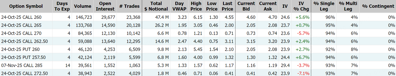 期權方面,蘋果當日期權成交168.46萬張,環比前一交易日激增近60%,看漲期權佔比攀升至72.5%,其中於10月24日到期的260美元行使價的看漲期權成交居前,成交逾14.67萬張。 $AAPL 20251024 260.0 CALL$