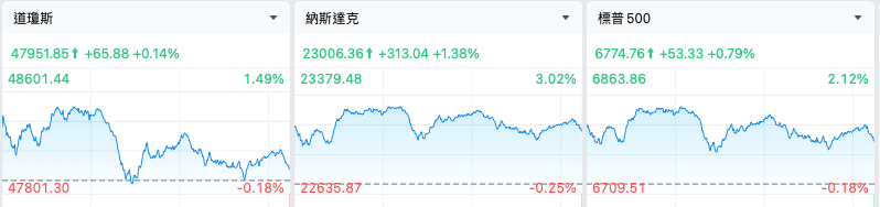 美東時間週四,在利好通脹數據的推動下,三大指數集體走高。截至收盤,道瓊斯指數漲0.14%,報47,951.85點;標普500指數漲0.79%,報6,774.76點;納斯達克指數漲1.38%,報23,006.36點。
