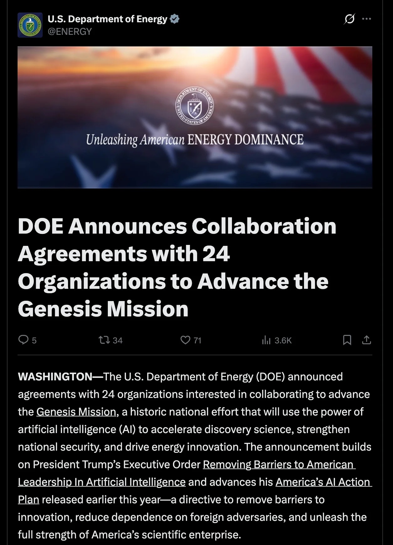 美國能源部(DOE)宣佈與24個組織達成協議。二十四家頂尖人工智能公司已同意加入美國聯邦政府的「創世使命」,這是特朗普政府為促進人工智能技術在科學發現和能源項目中的應用而發起的一項舉措。