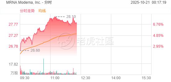週一盤中,生物技術公司 Moderna, Inc. 股價大幅上漲,漲幅一度達到8.03%,引發市場關注。