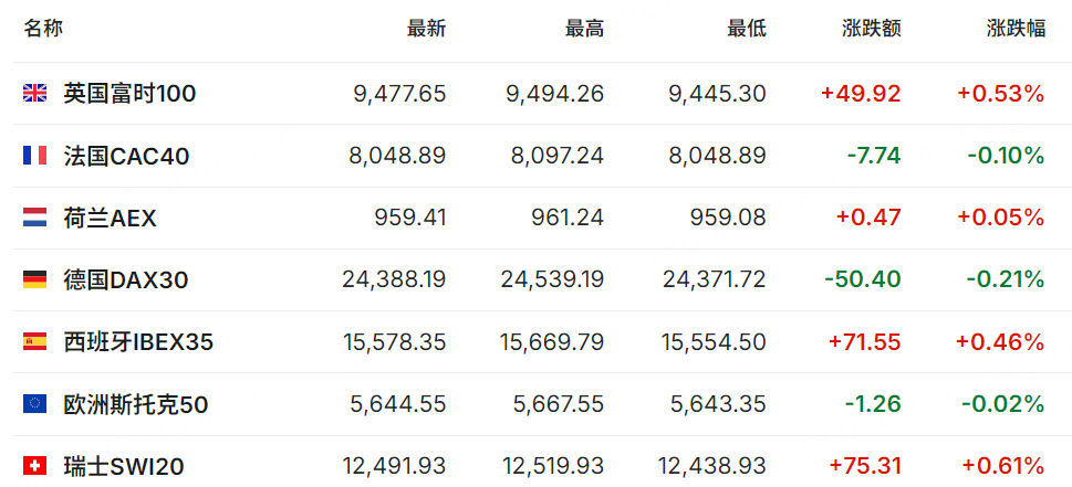 歐洲主要股指升跌各異,截至發稿,英國富時100漲0.53%,法國CAC40跌0.1%,德國DAX30指數跌0.21%。