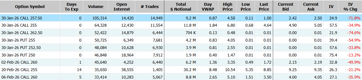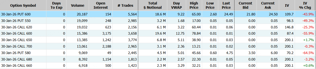 閃迪上周五收高6.85%,期權合約成交53.91萬張,較90日均量放大9.1倍。1月30日到期的600美元的行權看跌期權交易量特別高,共有20,187份合約交易。