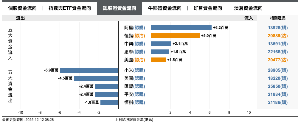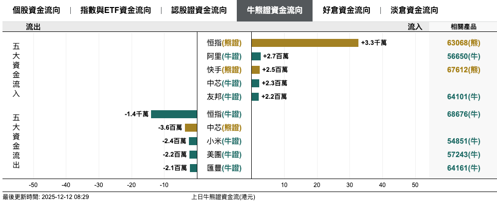 恒指熊證上日淨流入3300萬元,阿里牛證淨流入27萬元,快手熊證淨流入250萬元;