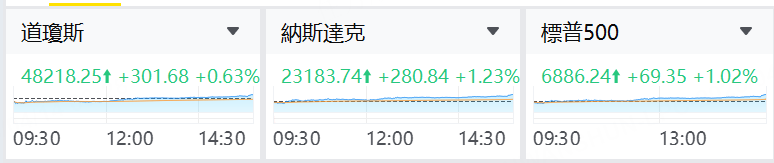 周一,美股三大指數上漲,納指、標普500指數升逾1%,標普收復年內跌幅。消息稱美伊之間的接觸仍在繼續,而且「在爭取達成協議方面正取得進展」。截至收盤,標普500指數漲1.02%,報6886.24點;納斯達克綜合指數漲1.23%,報23183.74點;道瓊斯工業平均指數漲0.63%,報48218.25點。