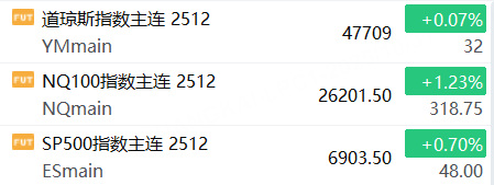 10月31日,美股三大股指期貨上漲,截止發稿,道指期貨漲0.07%,納指期貨漲1.23%,標普500指數期貨漲0.70%。