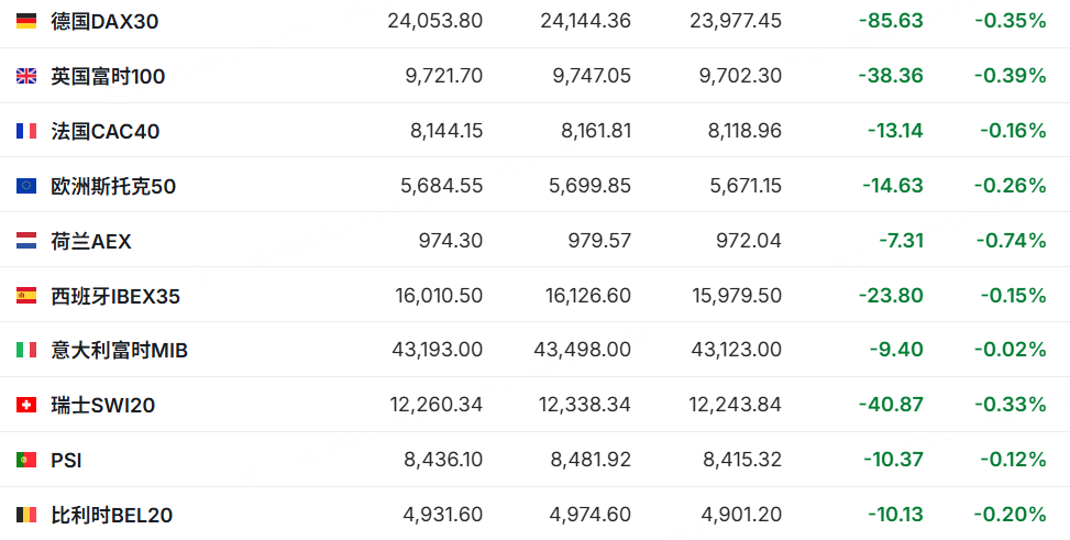 歐洲主要股指普跌,德國DAX30跌0.35%,法國CAC40跌0.16%。