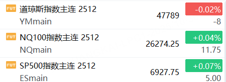 10月30日,美股三大股指期貨升跌不一,截止發稿,道指期貨跌0.02%,納指期貨漲0.04%,標普500指數期貨漲0.07%。
