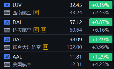 財報發佈後,達美航空美股盤前漲超6%!受此利好提振,美股航空股盤前普漲,美國航空漲超4%,聯合大陸航空漲近4%,西南航空漲超2%