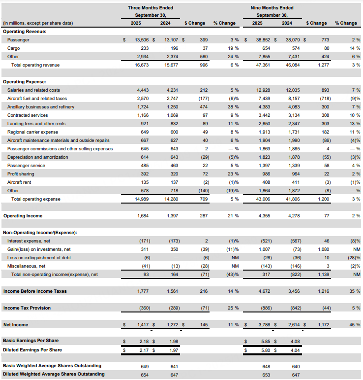 10月9日,達美航空發佈2025年第三季度業績。財報顯示,第三季度營收166.73億美元,去年同期156.77億美元;淨利潤14.17億美元,市場預期9.68億美元,去年同期12.72億美元;每股收益2.17美元,市場預期1.51美元,去年同期1.97美元。