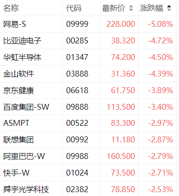 成分股中,網易-S跌超5%,比亞迪電子、華虹半導體、金山軟件跌超4%。
