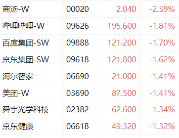 盤面上,大型科技股集體低開,其中,百度跌1.7%,京東跌1.62%,美團跌1.4%,保險股、餐飲股、黃金股、鋁業股、家電股多數下跌,中國人壽、兆易創新、友邦保險跌近2%。