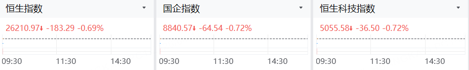 4月17日,港股三大指數低開,恒指跌0.69%,國指跌0.72%,恒生科技指數跌0.72%。