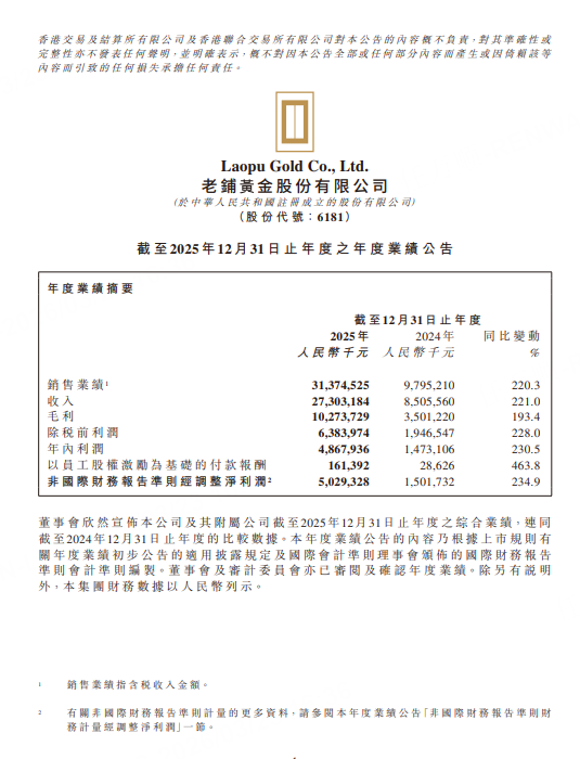 老鋪黃金2025全年營收273.0億元人民幣,預估269億元人民幣;全年淨利潤48.7億元人民幣,預估48.2億元人民幣;每股末期股息11.95元人民幣。
