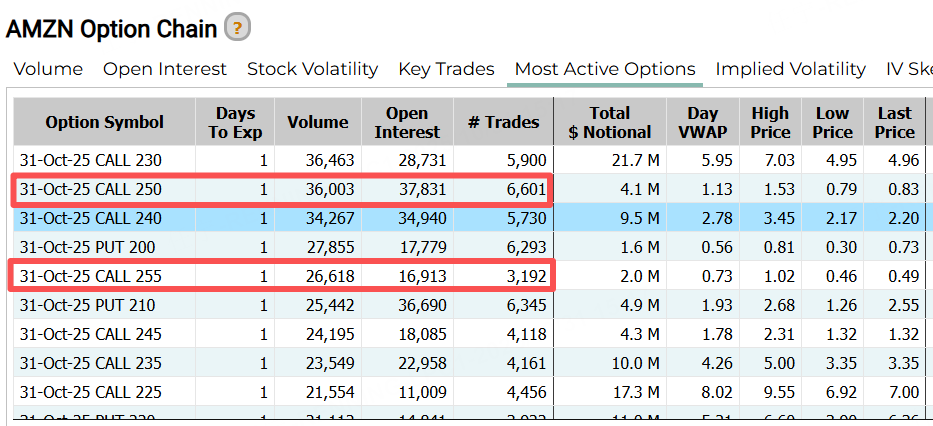 亞馬遜週四成交量排名前十的期權合約中,出現了兩張行權價250美元及以上的CALL,超過該股價格的歷史紀錄,表現了積極的態度。