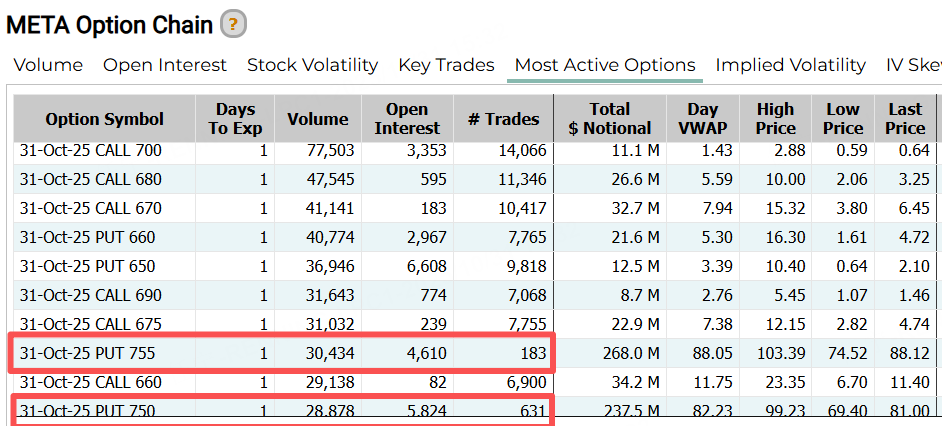 週四Meta期權合約成交量達233萬份,較前一交易日增長374%。其中兩張PUT的行權價分別達到750及755美元,根據當前行情,應該已有投資者獲得豐厚收益。