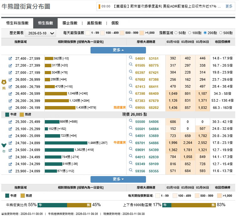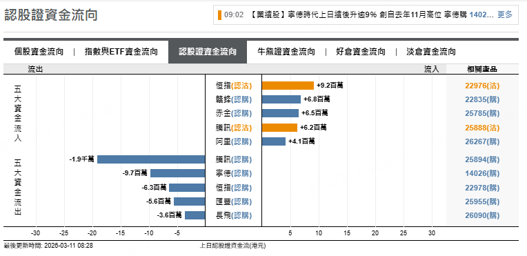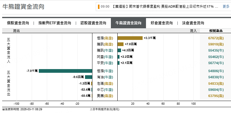 恒指牛證上日流出7000萬元,海油牛證上日流出960萬元,泡瑪熊證流出120萬元。