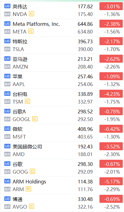 明星科技股盤前下跌,亞馬遜、谷歌、AMD、博通跌超2%,英偉達、特斯拉、Meta、蘋果、微軟跌超1%;