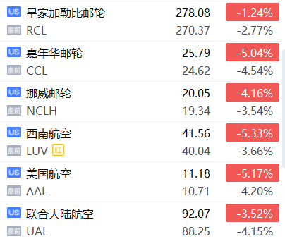 航空股、郵輪股盤前普跌, 美國航空、聯合大陸航空跌超4%,西南航空跌超3%;嘉年華郵輪跌超4%,挪威郵輪跌超3%,皇家加勒比郵輪跌超2%。