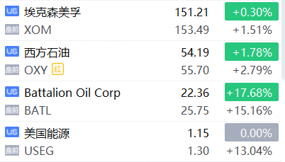 石油股盤前上漲,Battalion Oil升逾15%,美國能源升逾13%,西方石油、埃克森美孚、雪佛龍跟漲;