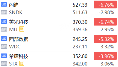 存儲概念股普跌,西部數據、希捷科技跌超3%,美光科技、閃迪跌近3%;
