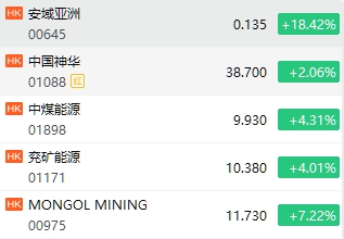 9月19日(週五),港股煤炭股持續活躍,安域亞洲漲超18%,MONGOL MINING漲超7%,兗礦能源、中煤能源張超4%,中國神華漲超2%。