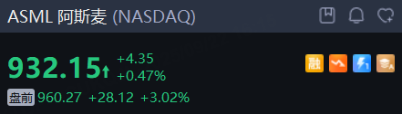 另一方面,阿斯麥盤前漲超3%,摩根士丹利將其歐股目標價從600歐元大幅上調至950歐元。台積電漲0.55%,博通漲0.05%。