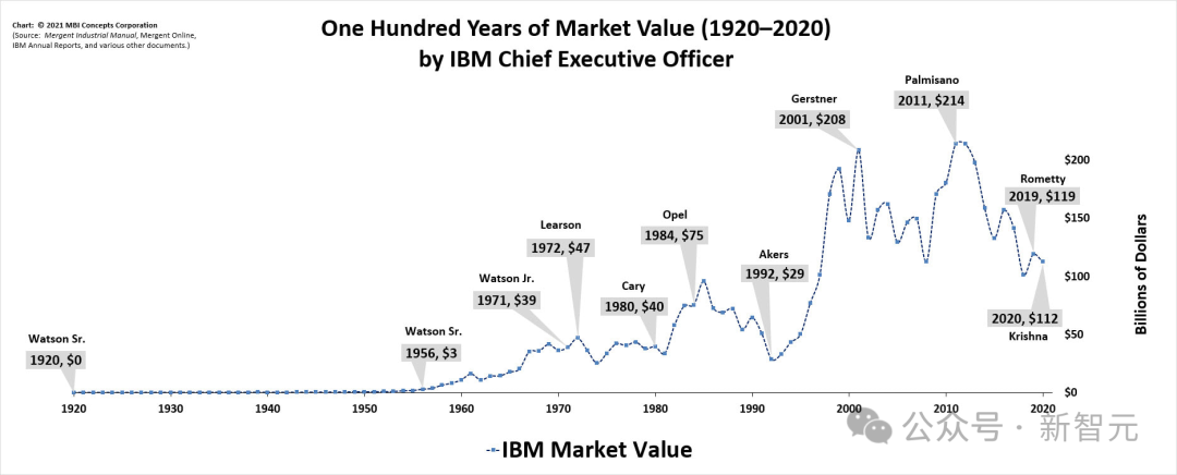 至2002年卸任時,郭士納將IBM的市值從接手時的290億美元拉昇至1680億美元,股價累計漲幅達800%