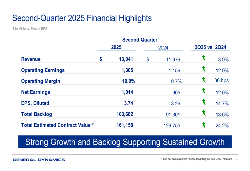 通用動力第二季度營收為130.4億美元,比去年同期的119.8億美元增長8.9%。營業收益增長12.9%至13.1億美元,而淨收益增長12.0%至10.1億美元。攤薄每股收益達到3.74美元,較2024年第二季度提高14.7%。